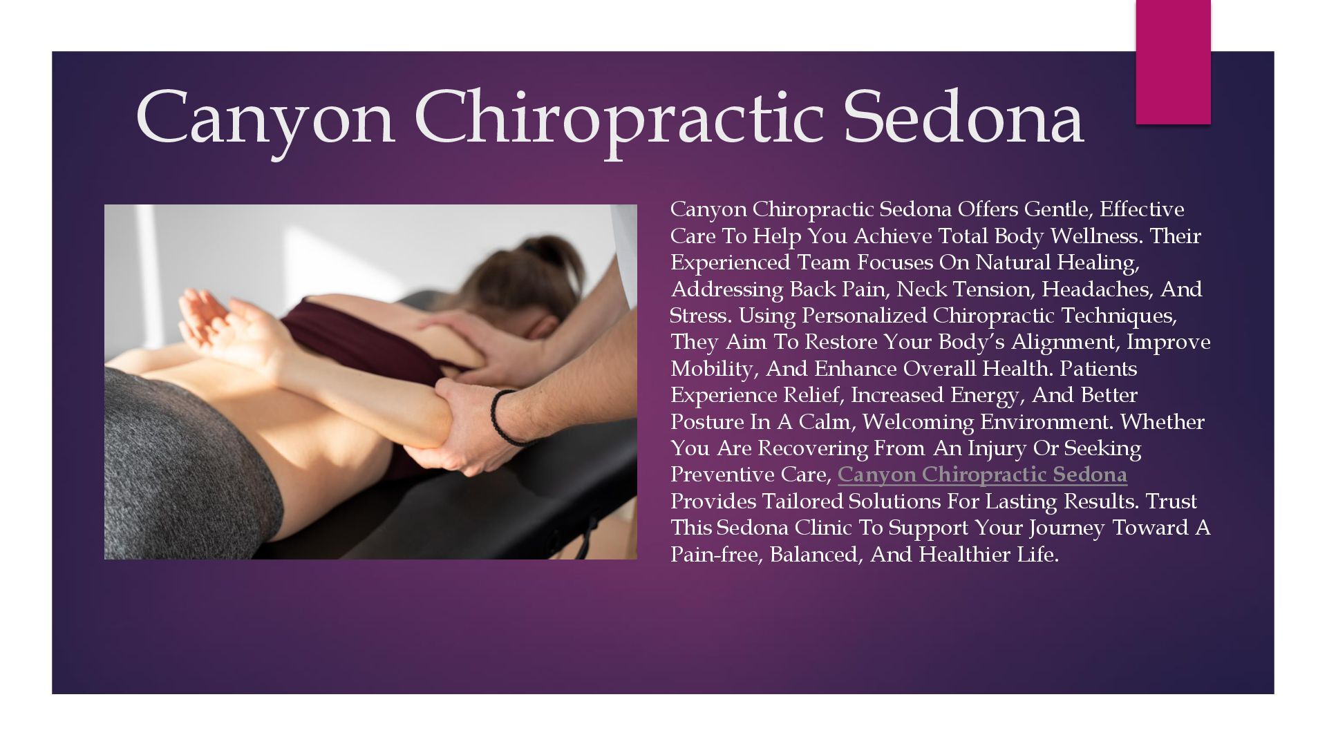 To Help You Achieve Total Body Wellness. Their Experienced Team Focuses On Natural Healing, Addressing Back Pain, Neck Tension, Headaches, And Stress. Using Personalized Chiropractic Techniques, They Aim To Restore Your Body’s Alignment, Improve Mobility, And Enhance Overall Health. Patients Experience Relief, Increased Energy, And Better Posture In A Calm, Welcoming Environment. Whether You Are Recovering From An Injury Or Seeking Preventive Care, Canyon Chiropractic Sedona Provides Tailored Solutions For Lasting Results. Trust This Sedona Clinic To Support Your Journey Toward A Pain-free, Balanced, And Healthier Life.