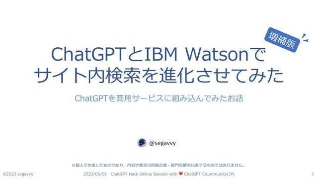 2023年6月6日に開催されたChatGPT Hack Online Sessionで、ChatGPTとIBM Watson Discoveryの連携サービスについてお話した際の資料です。 動画(スライド画面+音声)はこちらです。 https://www.youtube.com/live/eJn08_bgecM?feature=shared&t=2647