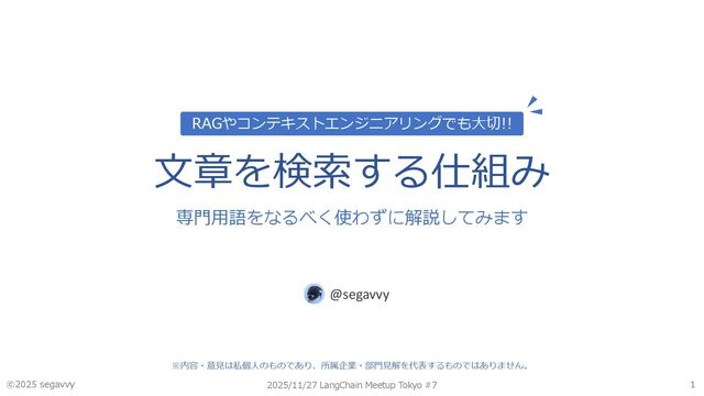 2025年11月27日に開催されたLangChain Meetup Tokyo #7( https://langchain.connpass.com/event/374899/ )で、検索についてお話しした際の資料です。