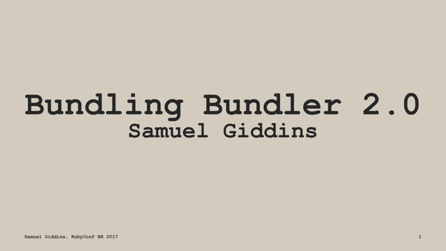 all settings $ bundle config "path" # print the current `path` setting $ bundle config "path" "vendor" # set the path to "vendor" $ bundle config --delete "path" # delete the current setting for `path` Samuel Giddins, RubyConf BR 2017 25