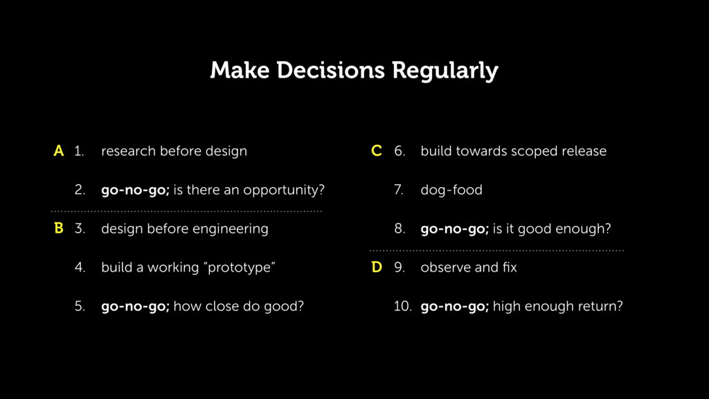 3. design before engineering 4. build a working “prototype” 5. go-no-go; how close do good? 6. build towards scoped release 7. dog-food 8. go-no-go; is it good enough? 9. observe and fix 10. go-no-go; high enough return? Make Decisions Regularly A B C D