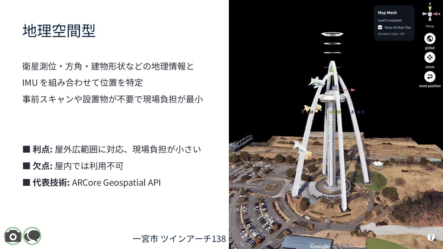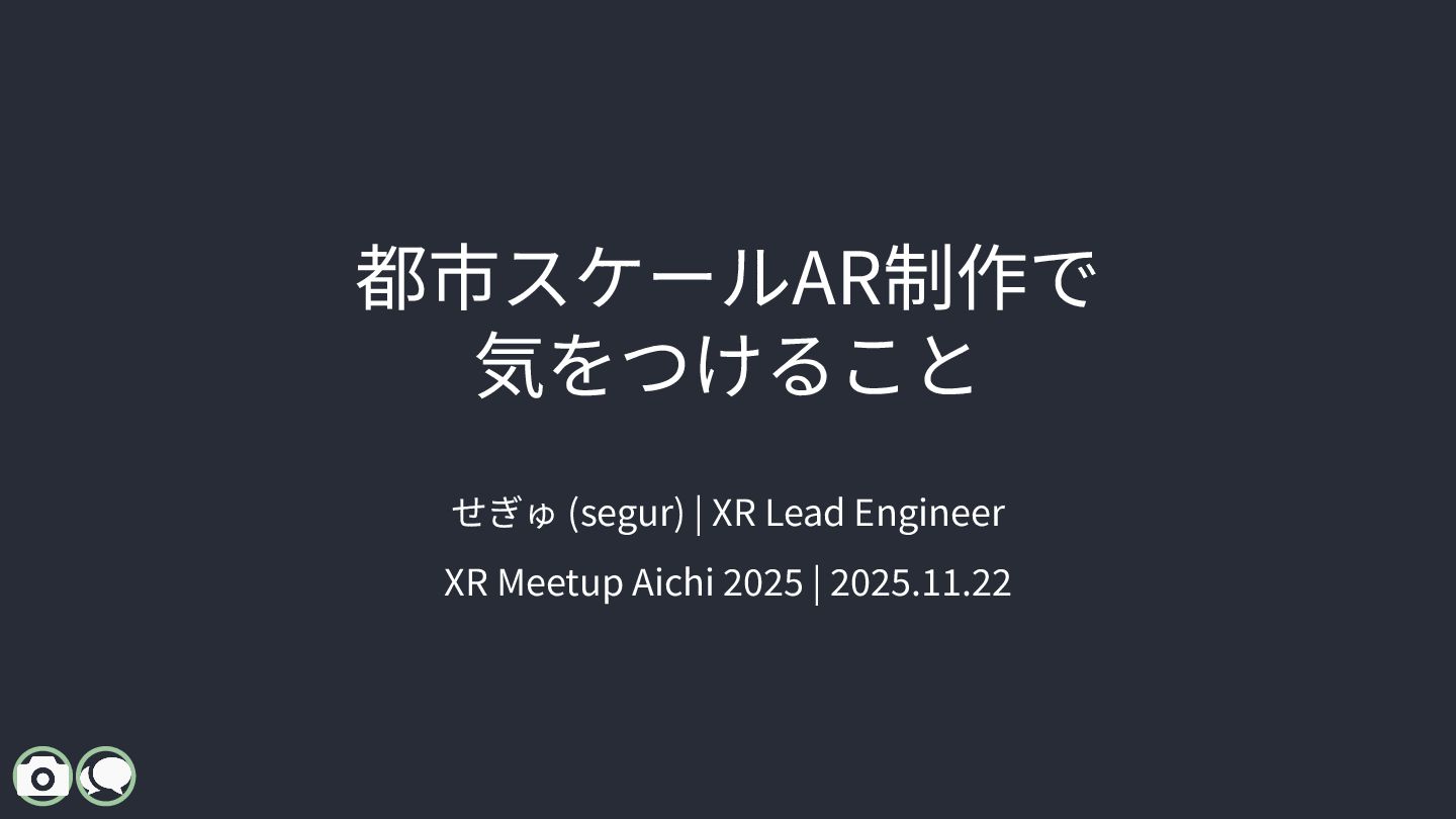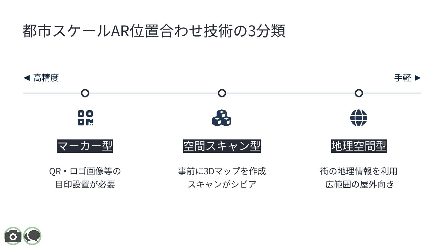 XR Meetup Aichi 2025(名古屋 / 2025.11.22)で登壇した際のスライドです。 都市スケールARにおける位置合わせ技術を、 「マーカー型 / 空間スキャン型 / 地理空間型」の3分類で整理しています。