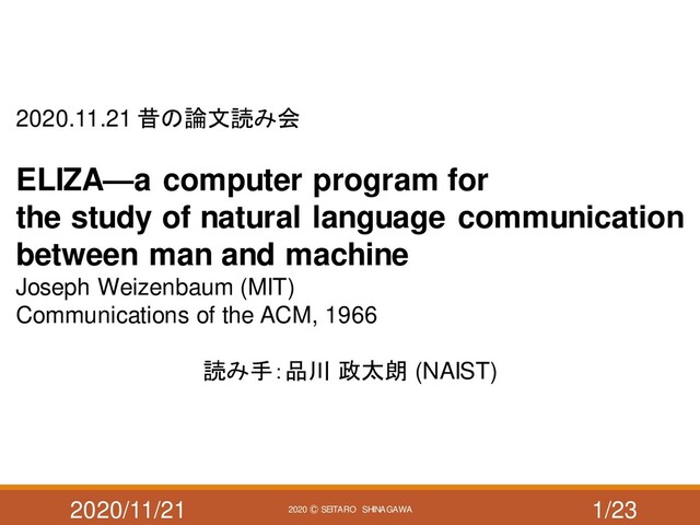 for the study of natural language communication between man and machine Joseph Weizenbaum (MIT) Communications of the ACM, 1966 読み手:品川 政太朗 (NAIST) 1/23