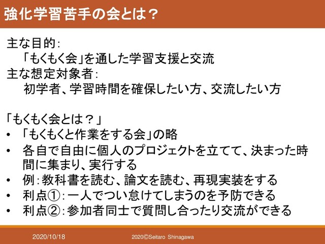 2020/10/18 2020ⒸSeitaro Shinagawa 強化学習苦手の会とは? 主な目的: 「もくもく会」を通した学習支援と交流 主な想定対象者: 初学者、学習時間を確保したい方、交流したい方 「もくもく会とは?」 •