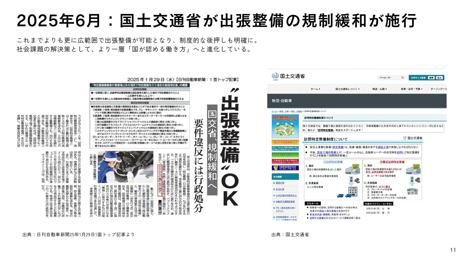 これまでよりも更に広範囲で出張整備が可能となり、制度的な後押しも明確に。 社会課題の解決策として、より一層「国が認める働き方」へと進化している。 2025年6月:国土交通省が出張整備の規制緩和が施行 出典:国土交通省 出典:日刊自動車新聞25年1月29日1面トップ記事より 11
