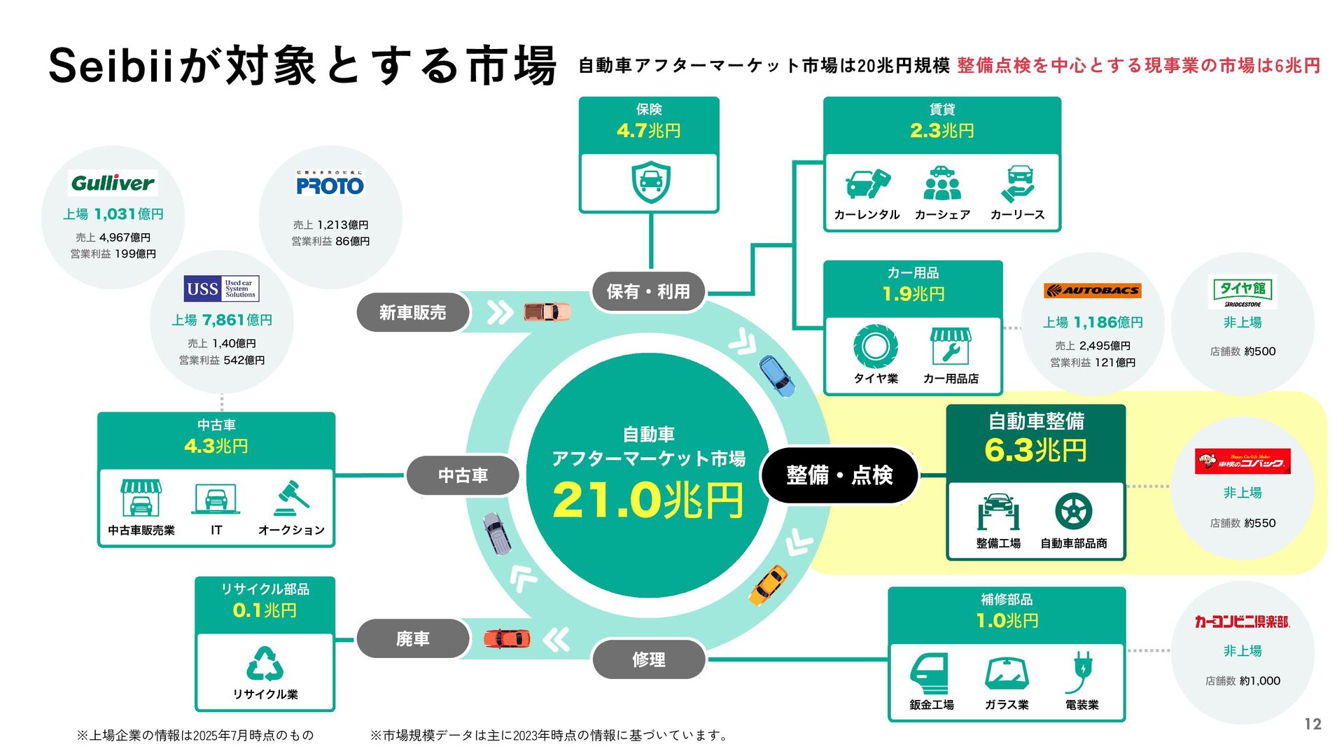 廃車 中古車 4.3兆円 自動車整備 6.3兆円 保険 4.7兆円 リサイクル部品 0.1兆円 上場 1,031億円 上場 1,186億円 非上場 非上場 非上場 補修部品 1.0兆円 カー用品 1.9兆円 賃貸 2.3兆円 売上 1,40億円 営業利益 542億円 売上 1,213億円 営業利益 86億円 売上 4,967億円 営業利益 199億円 売上 2,495億円 営業利益 121億円 店舗数 約500 店舗数 約1,000 店舗数 約550 鈑金工場 ガラス業 電装業 整備工場 自動車部品商 タイヤ業 カー用品店 カーレンタル カーシェア カーリース リサイクル業 中古車販売業 IT オークション ※上場企業の情報は2025年7月時点のもの ※市場規模データは主に2023年時点の情報に基づいています。 Seibiiが対象とする市場 自動車アフターマーケット市場は20兆円規模 整備点検を中心とする現事業の市場は6兆円 12