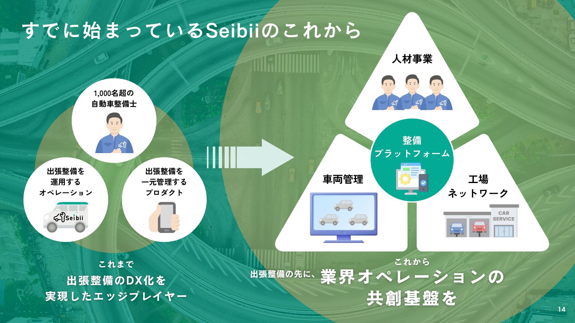 自動車整備士 出張整備を 一元管理する プロダクト 出張整備のDX化を 実現したエッジプレイヤー 業界オペレーションの 共創基盤を これまで これから 出張整備の先に、 14 すでに始まっているSeibiiのこれから