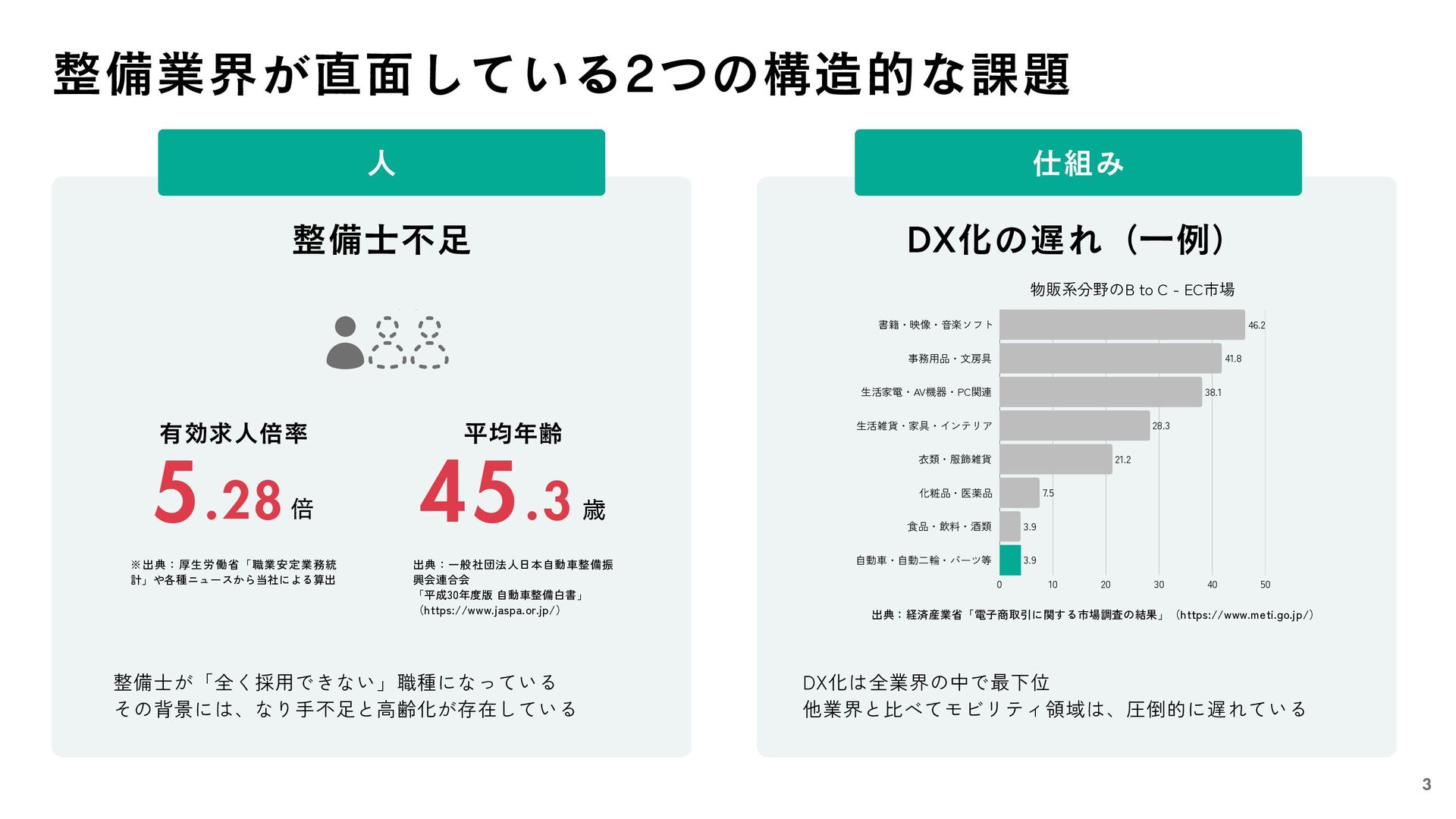 50 書籍・映像・音楽ソフト 事務用品・文房具 生活家電・AV機器・PC関連 生活雑貨・家具・インテリア 衣類・服飾雑貨 化粧品・医薬品 食品・飲料・酒類 自動車・自動二輪・パーツ等 46.2 41.8 38.1 28.3 21.2 7.5 3.9 3.9 整備業界が直面している2つの構造的な課題 整備士不足 整備士が「全く採用できない」職種になっている その背景には、なり手不足と高齢化が存在している DX化の遅れ(一例) 出典:経済産業省「電子商取引に関する市場調査の結果」(https://www.meti.go.jp/) DX化は全業界の中で最下位 他業界と比べてモビリティ領域は、圧倒的に遅れている 平均年齢 出典:一般社団法人日本自動車整備振 興会連合会 「平成30年度版 自動車整備白書」 (https://www.jaspa.or.jp/) 45 歳 .3 有効求人倍率 ※出典:厚生労働省「職業安定業務統 計」や各種ニュースから当社による算出 5 倍 .28 人 仕組み 3