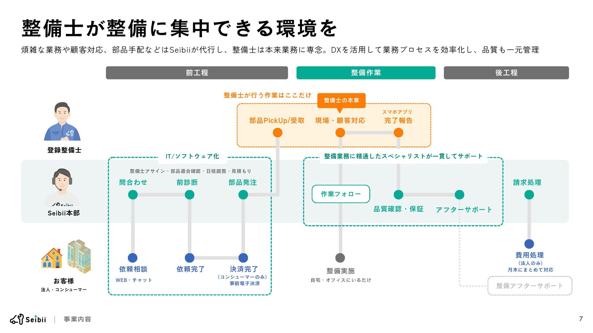 事業内容 前工程 整備作業 整備アフターサポート 品質確認・保証 アフターサポート 作業フォロー 整備士の本業 後工程 整備業務に精通したスペシャリストが一貫してサポート