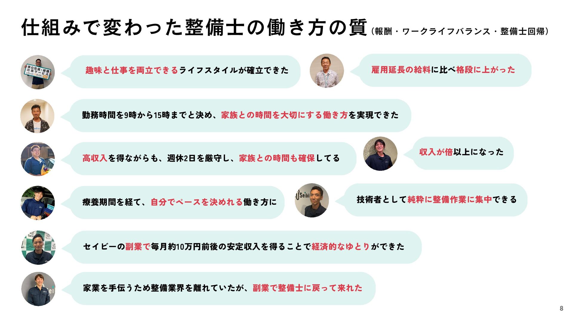 収入が倍以上になった 趣味と仕事を両立できるライフスタイルが確立できた 勤務時間を9時から15時までと決め、家族との時間を大切にする働き方を実現できた 高収入を得ながらも、週休2日を厳守し、家族との時間も確保してる 雇用延長の給料に比べ格段に上がった 技術者として純粋に整備作業に集中できる 療養期間を経て、自分でペースを決めれる働き方に セイビーの副業で毎月約10万円前後の安定収入を得ることで経済的なゆとりができた 家業を手伝うため整備業界を離れていたが、副業で整備士に戻って来れた (報酬・ワークライフバランス・整備士回帰)