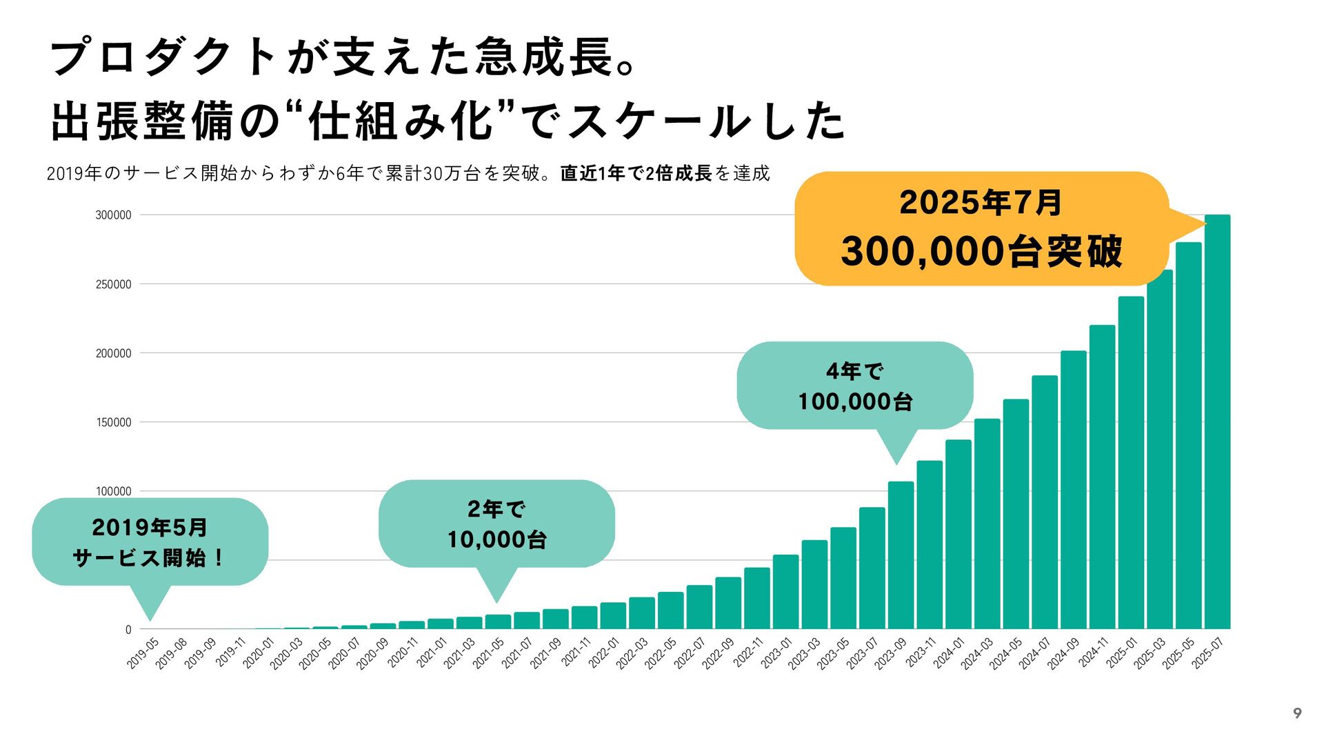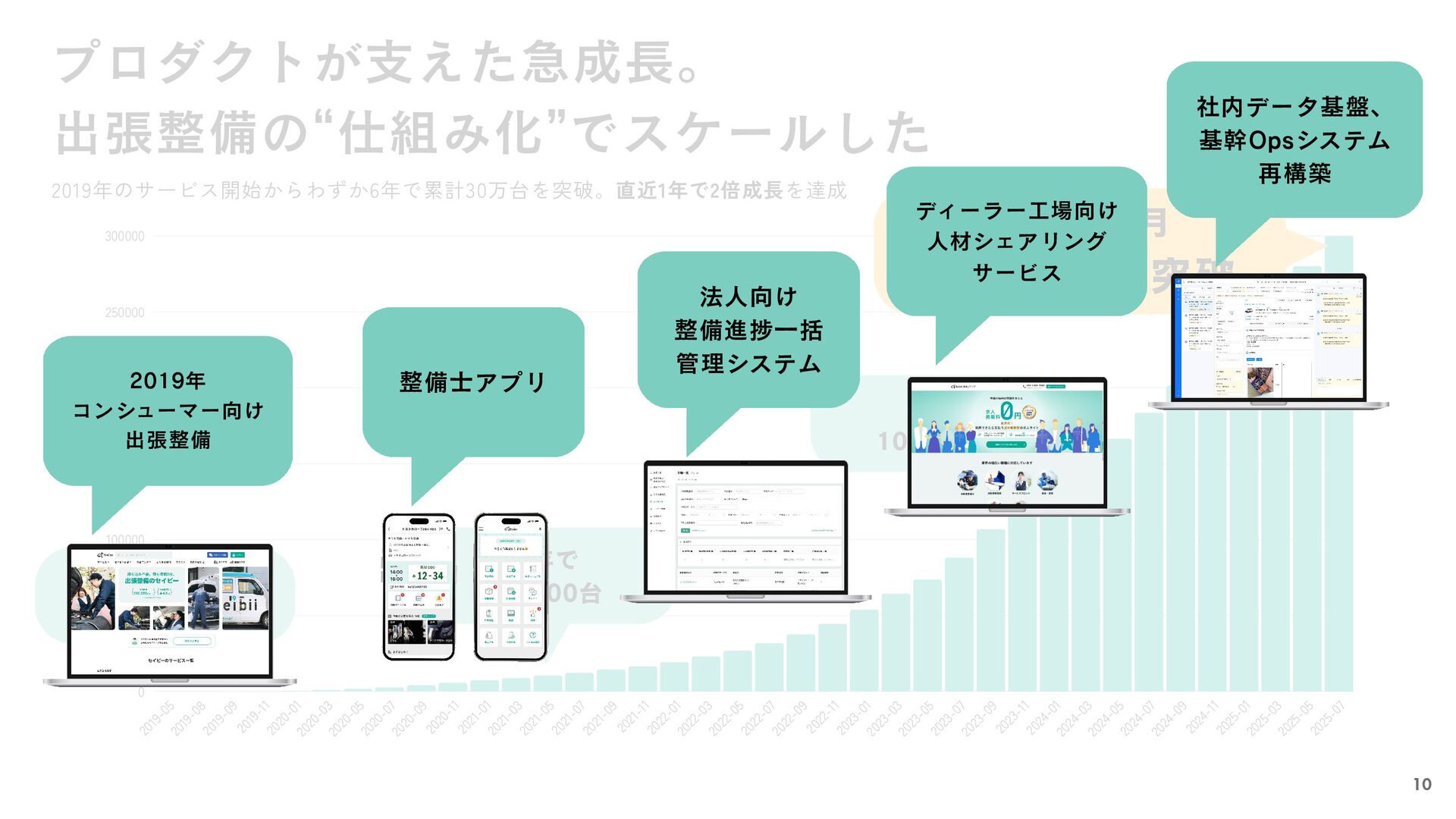 2021-01 2021-03 2021-05 2021-07 2021-09 2021-11 2022-01 2022-03 2022-05 2022-07 2022-09 2022-11 2023-01 2023-03 2023-05 2023-07 2023-09 2023-11 2024-01 2024-03 2024-05 2024-07 2024-09 2024-11 2025-01 2025-03 2025-05 2025-07 0 50000 100000 150000 200000 250000 300000 2019年5月 サービス開始! 2年で 10,000台 2025年7月 300,000台突破 4年で 100,000台 2019年のサービス開始からわずか6年で累計30万台を突破。直近1年で2倍成長を達成 プロダクトが支えた急成長。 出張整備の“仕組み化”でスケールした 9