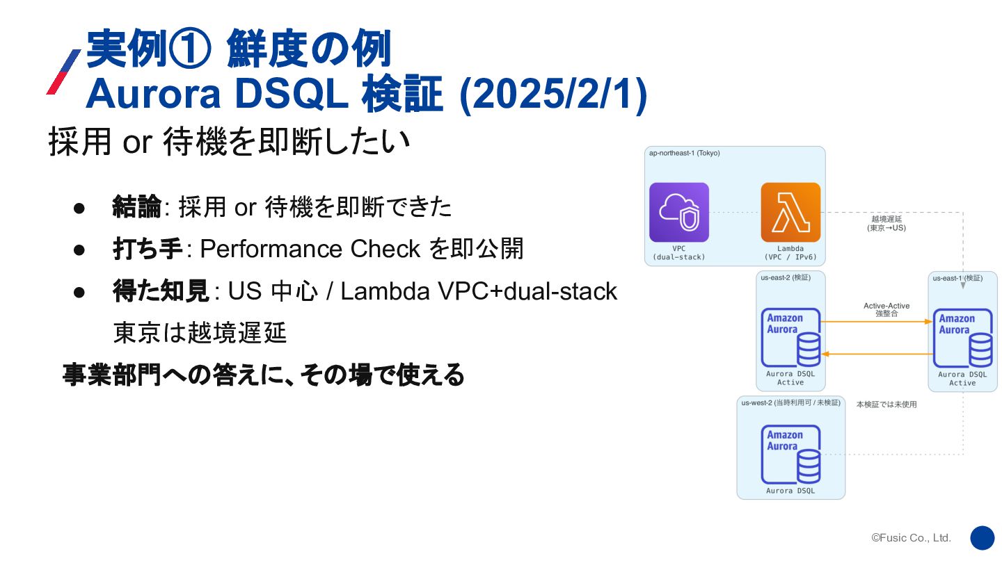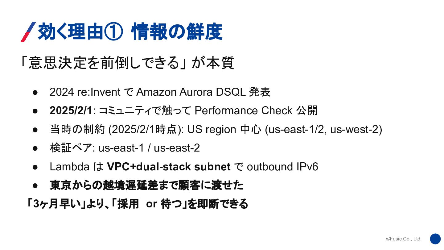 で Amazon Aurora DSQL 発表 • 2025/2/1: コミュニティで触って Performance Check 公開 • 当時の制約 (2025/2/1時点): US region 中心 (us-east-1/2, us-west-2) • 検証ペア: us-east-1 / us-east-2 • Lambda は VPC+dual-stack subnet で outbound IPv6 • 東京からの越境遅延差まで顧客に渡せた 「3ヶ月早い」より、「採用 or 待つ」を即断できる