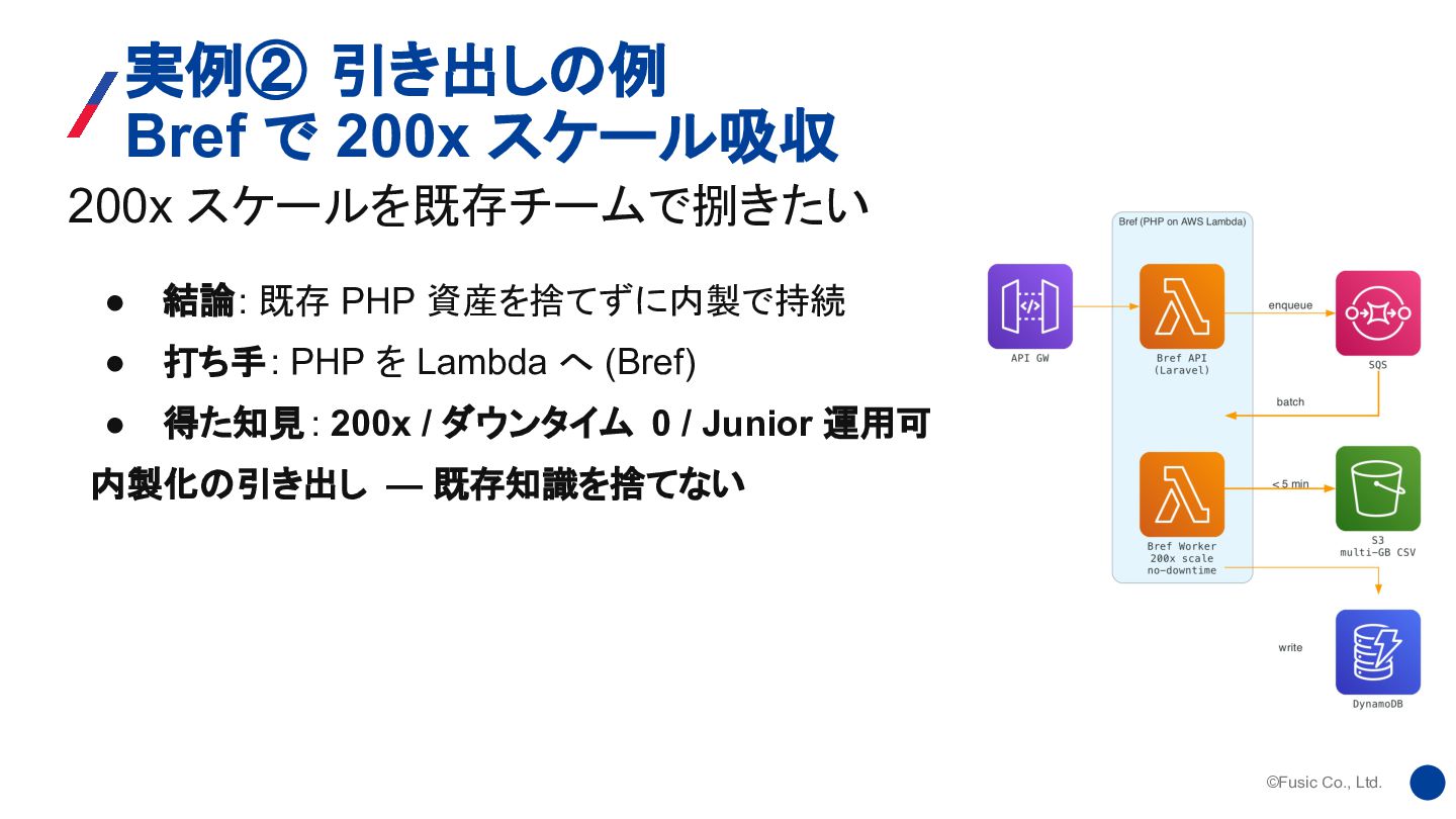 スケール吸収 • 結論: 既存 PHP 資産を捨てずに内製で持続 • 打ち手: PHP を Lambda へ (Bref) • 得た知見: 200x / ダウンタイム 0 / Junior 運用可 内製化の引き出し — 既存知識を捨てない