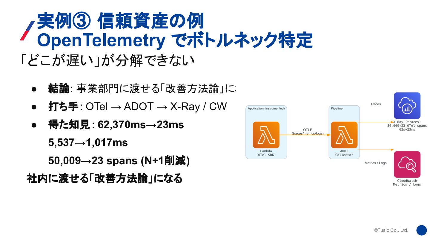 ©Fusic Co., Ltd. 「どこが遅い」が分解できない 実例③ 信頼資産の例 OpenTelemetry でボトルネック特定 • 結論: