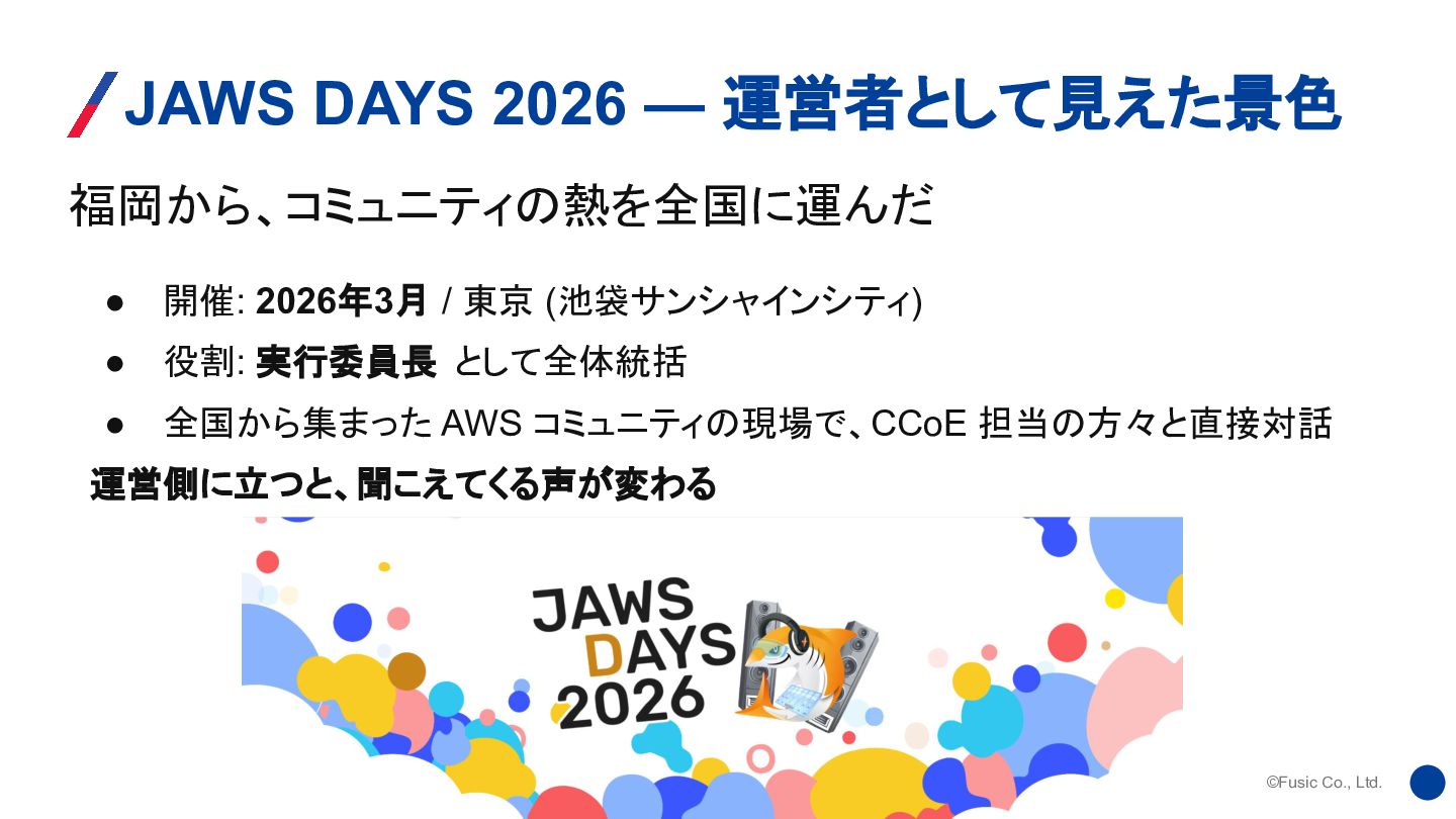 開催: 2026年3月 / 東京 (池袋サンシャインシティ) • 役割: 実行委員長 として全体統括 • 全国から集まった AWS コミュニティの現場で、CCoE 担当の方々と直接対話 運営側に立つと、聞こえてくる声が変わる