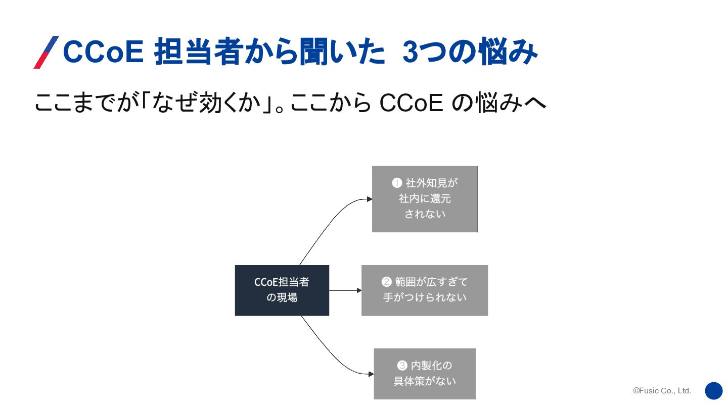 ©Fusic Co., Ltd. ここまでが「なぜ効くか」。ここから CCoE の悩みへ CCoE 担当者から聞いた 3つの悩み