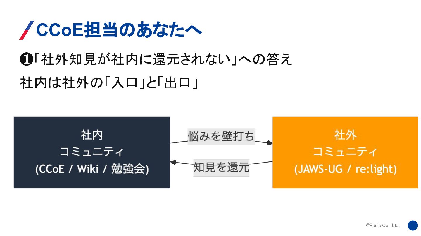 ©Fusic Co., Ltd. ❶「社外知見が社内に還元されない」への答え 社内は社外の「入口」と「出口」 CCoE担当のあなたへ