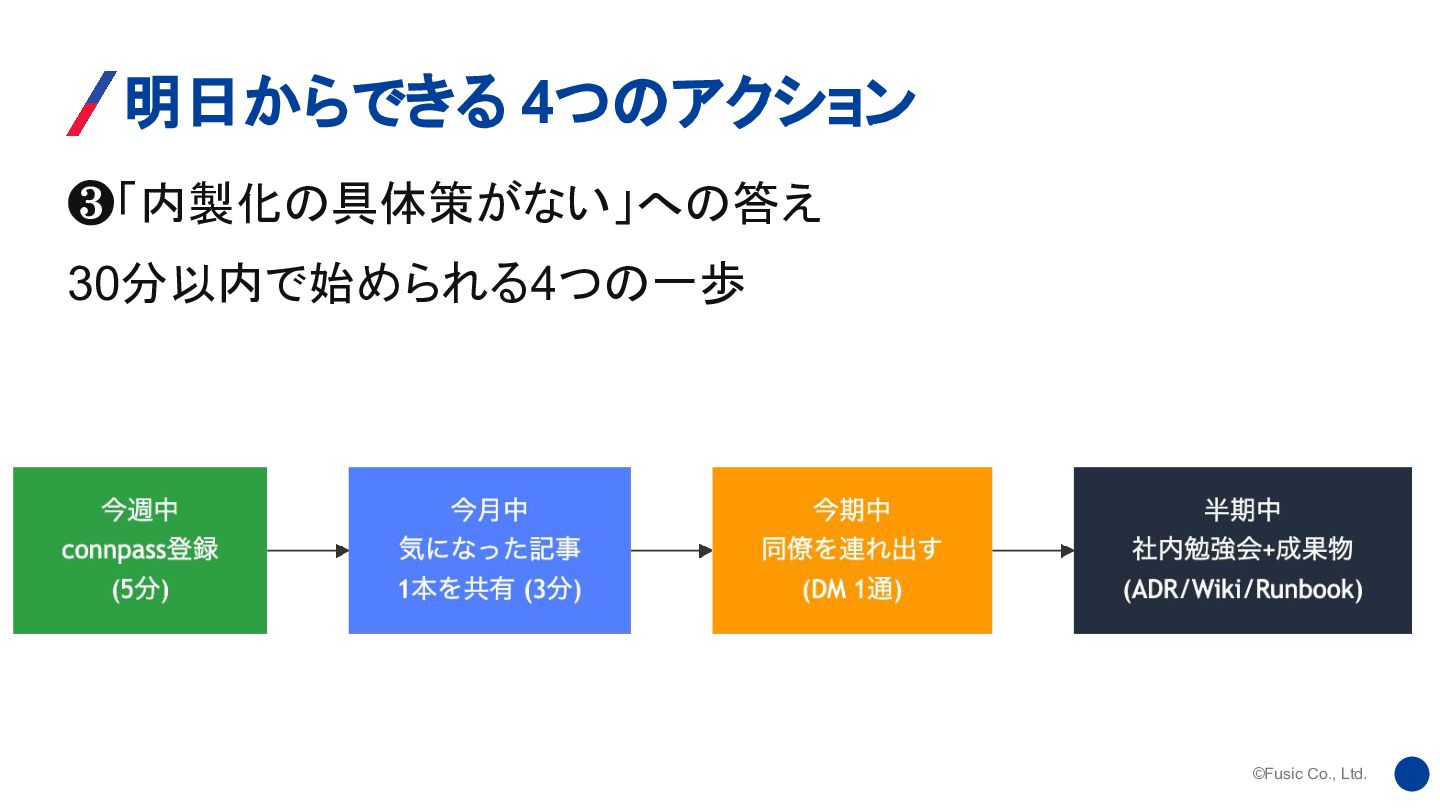 ©Fusic Co., Ltd. ❸「内製化の具体策がない」への答え 30分以内で始められる4つの一歩 明日からできる 4つのアクション