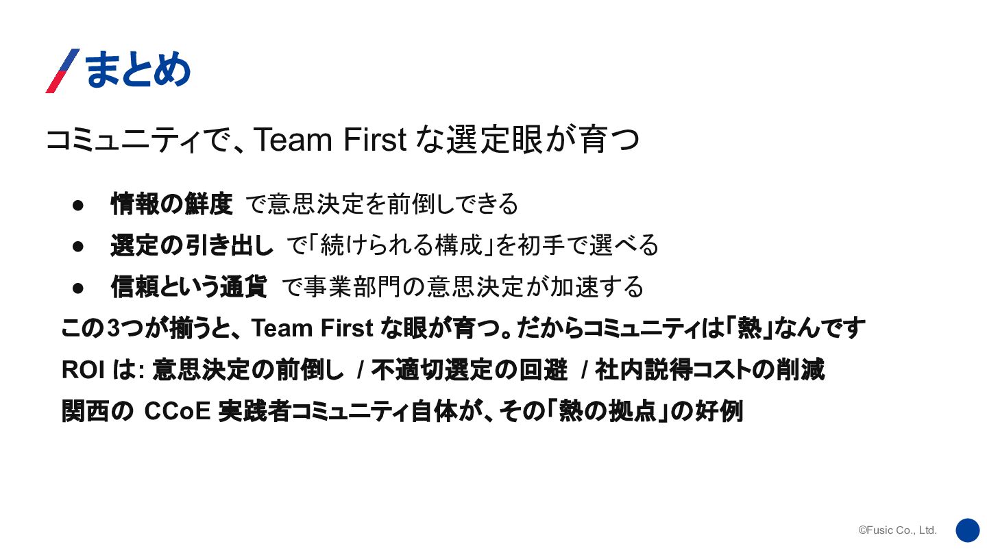 • 選定の引き出し で「続けられる構成」を初手で選べる • 信頼という通貨 で事業部門の意思決定が加速する この3つが揃うと、 Team First な眼が育つ。だからコミュニティは「熱」なんです ROI は: 意思決定の前倒し / 不適切選定の回避 / 社内説得コストの削減 関西の CCoE 実践者コミュニティ自体が、その「熱の拠点」の好例