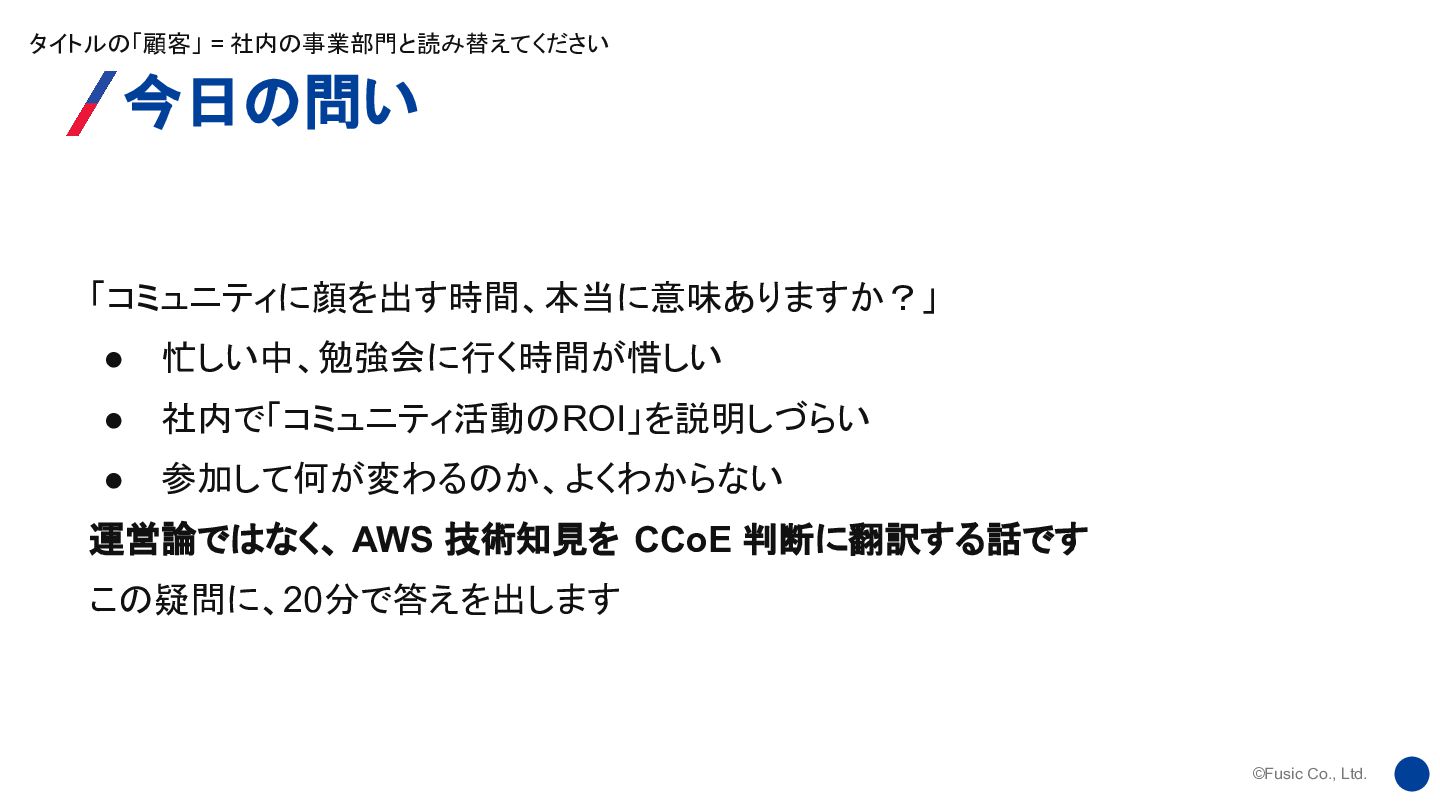 参加して何が変わるのか、よくわからない 運営論ではなく、 AWS 技術知見を CCoE 判断に翻訳する話です この疑問に、20分で答えを出します タイトルの「顧客」 = 社内の事業部門と読み替えてください