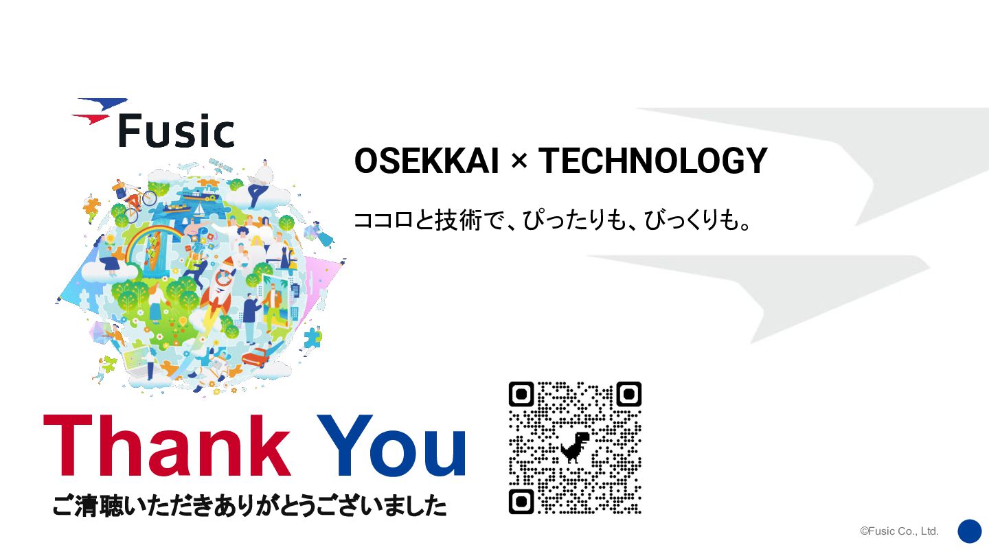 ©Fusic Co., Ltd. OSEKKAI × TECHNOLOGY ご清聴いただきありがとうございました Thank You ココロと技術で、ぴったりも、びっくりも。