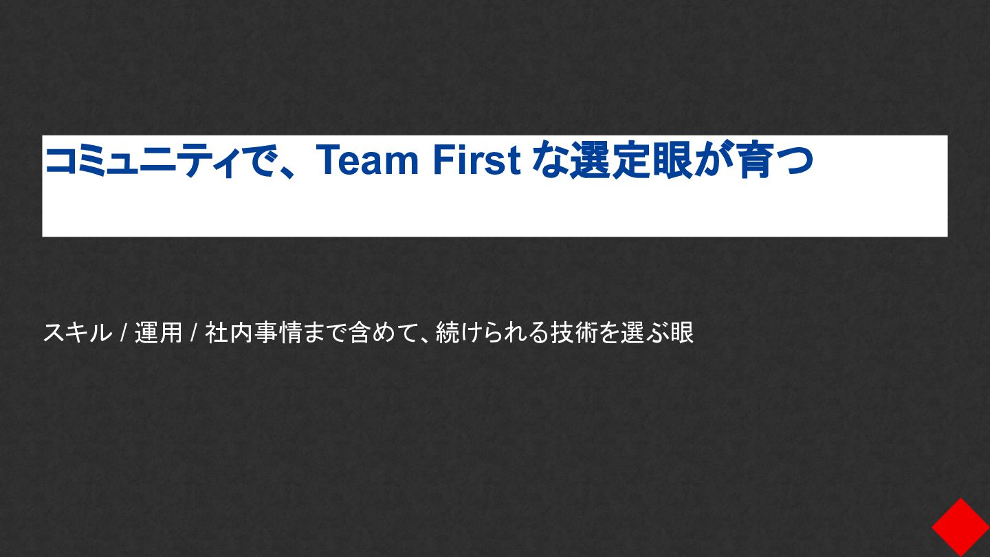 コミュニティで、 Team First な選定眼が育つ スキル / 運用 / 社内事情まで含めて、続けられる技術を選ぶ眼