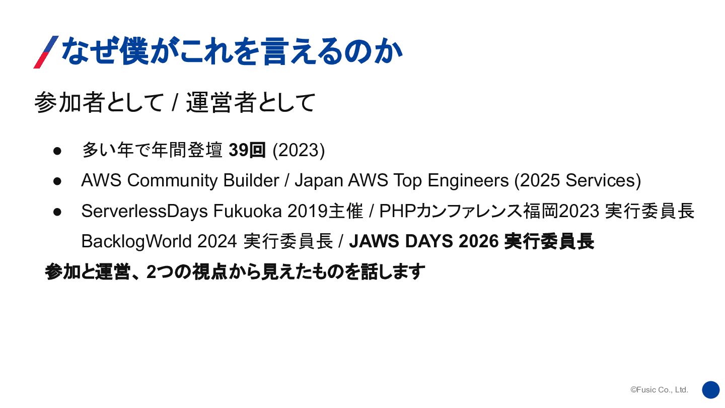 (2023) • AWS Community Builder / Japan AWS Top Engineers (2025 Services) • ServerlessDays Fukuoka 2019主催 / PHPカンファレンス福岡2023 実行委員長 BacklogWorld 2024 実行委員長 / JAWS DAYS 2026 実行委員長 参加と運営、 2つの視点から見えたものを話します