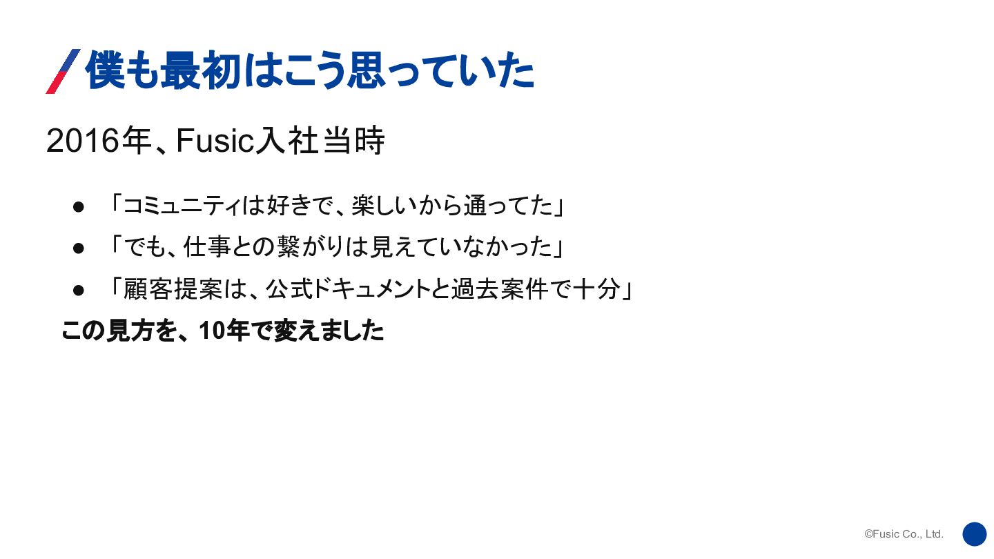 ©Fusic Co., Ltd. 2016年、Fusic入社当時 僕も最初はこう思っていた • 「コミュニティは好きで、楽しいから通ってた」 • 「でも、仕事との繋がりは見えていなかった」 •