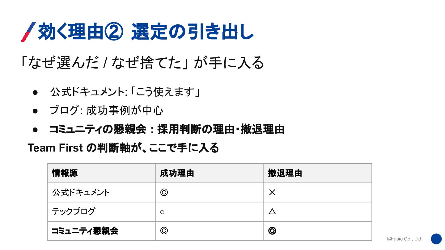 公式ドキュメント: 「こう使えます」 • ブログ: 成功事例が中心 • コミュニティの懇親会 : 採用判断の理由・撤退理由 Team First の判断軸が、ここで手に入る 情報源 成功理由 撤退理由 公式ドキュメント ◎ ✕ テックブログ ◦ △ コミュニティ懇親会 ◎ ◎