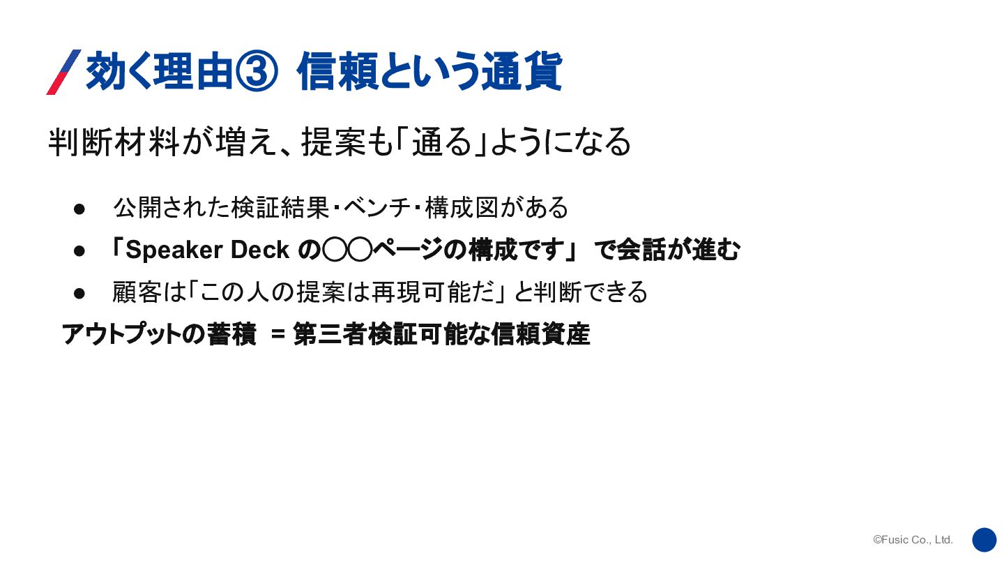 Deck の◯◯ページの構成です」 で会話が進む • 顧客は「この人の提案は再現可能だ」 と判断できる アウトプットの蓄積 = 第三者検証可能な信頼資産