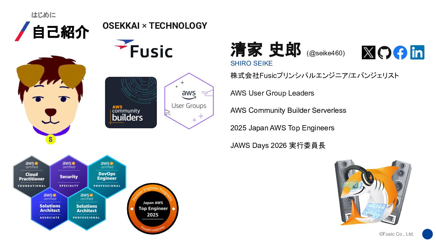 株式会社Fusicプリンシパルエンジニア/エバンジェリスト AWS User Group Leaders AWS Community Builder Serverless 2025 Japan AWS Top Engineers JAWS Days 2026 実行委員長 OSEKKAI × TECHNOLOGY