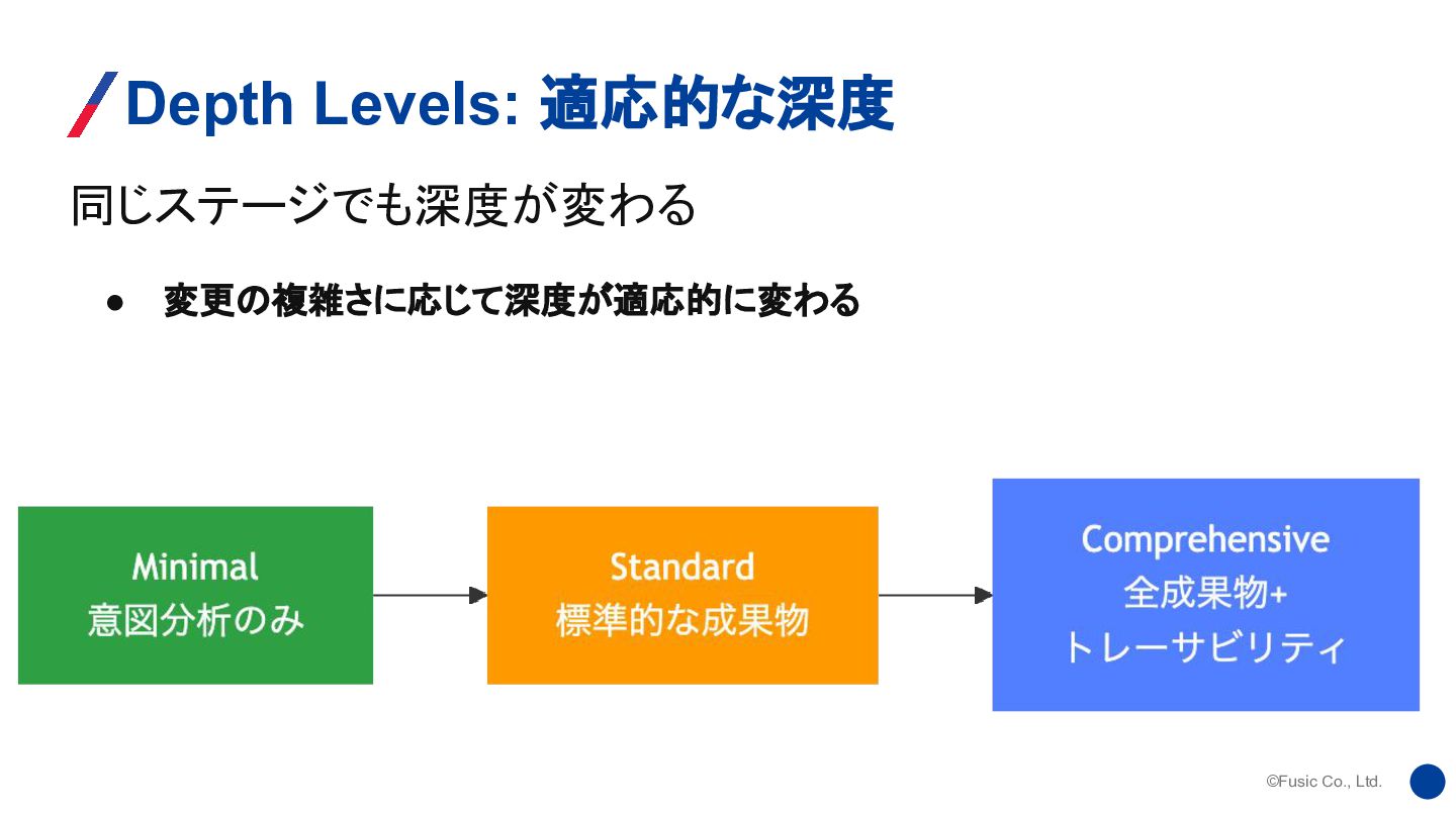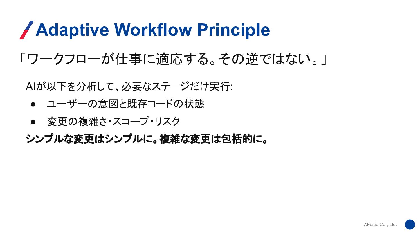 ©Fusic Co., Ltd. 「ワークフローが仕事に適応する。その逆ではない。」 Adaptive Workflow Principle AIが以下を分析して、必要なステージだけ実行: • ユーザーの意図と既存コードの状態