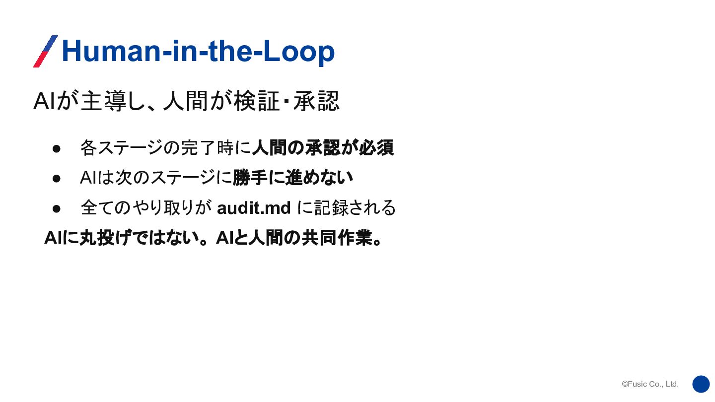 ©Fusic Co., Ltd. AIが主導し、人間が検証・承認 Human-in-the-Loop • 各ステージの完了時に人間の承認が必須 • AIは次のステージに勝手に進めない •