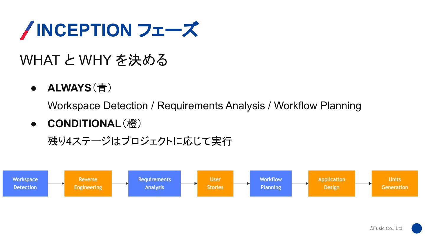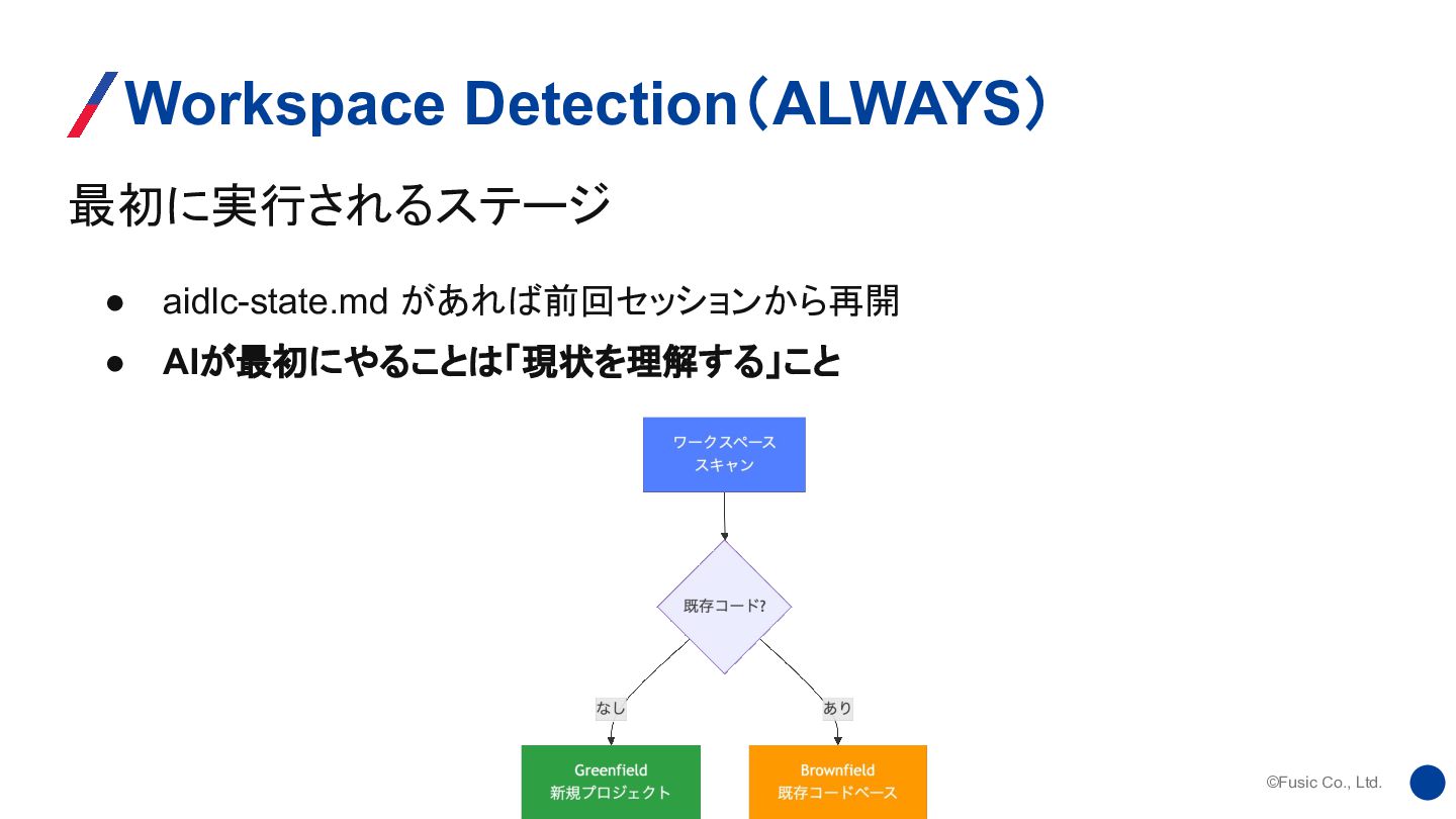 ©Fusic Co., Ltd. 最初に実行されるステージ Workspace Detection(ALWAYS) • aidlc-state.md があれば前回セッションから再開 •