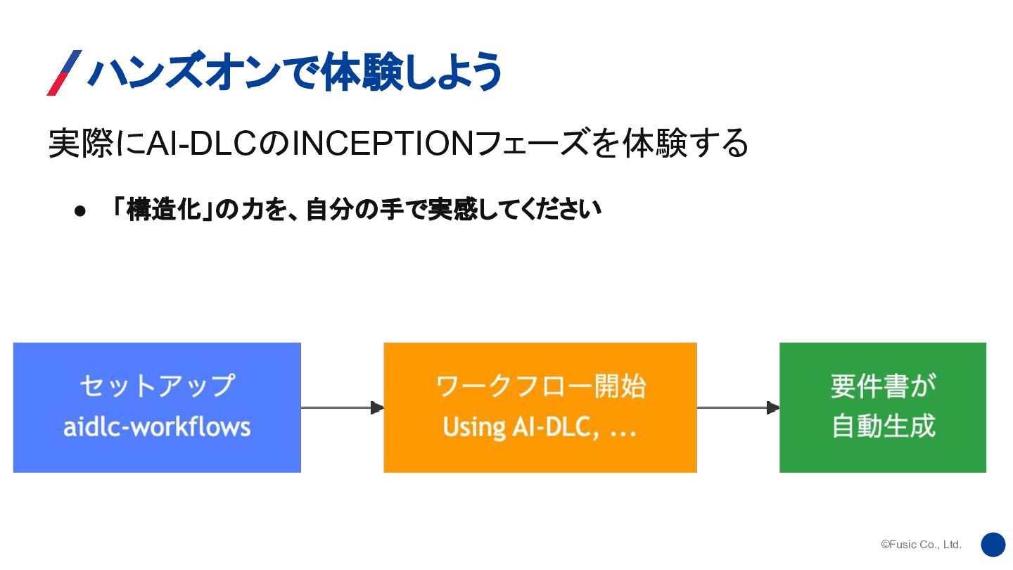 ©Fusic Co., Ltd. 実際にAI-DLCのINCEPTIONフェーズを体験する ハンズオンで体験しよう • 「構造化」の力を、自分の手で実感してください