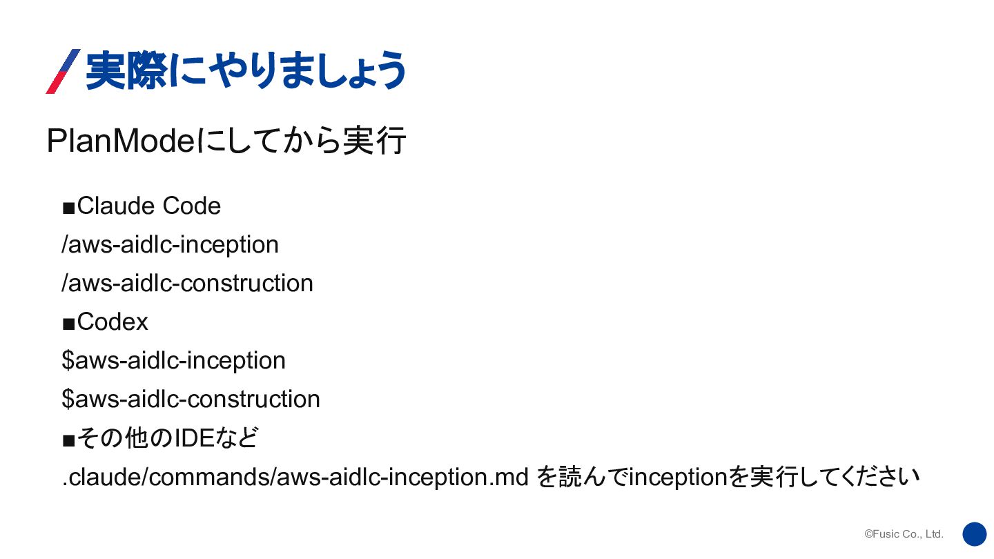 ©Fusic Co., Ltd. PlanModeにしてから実行 実際にやりましょう ▪Claude Code /aws-aidlc-inception /aws-aidlc-construction ▪Codex