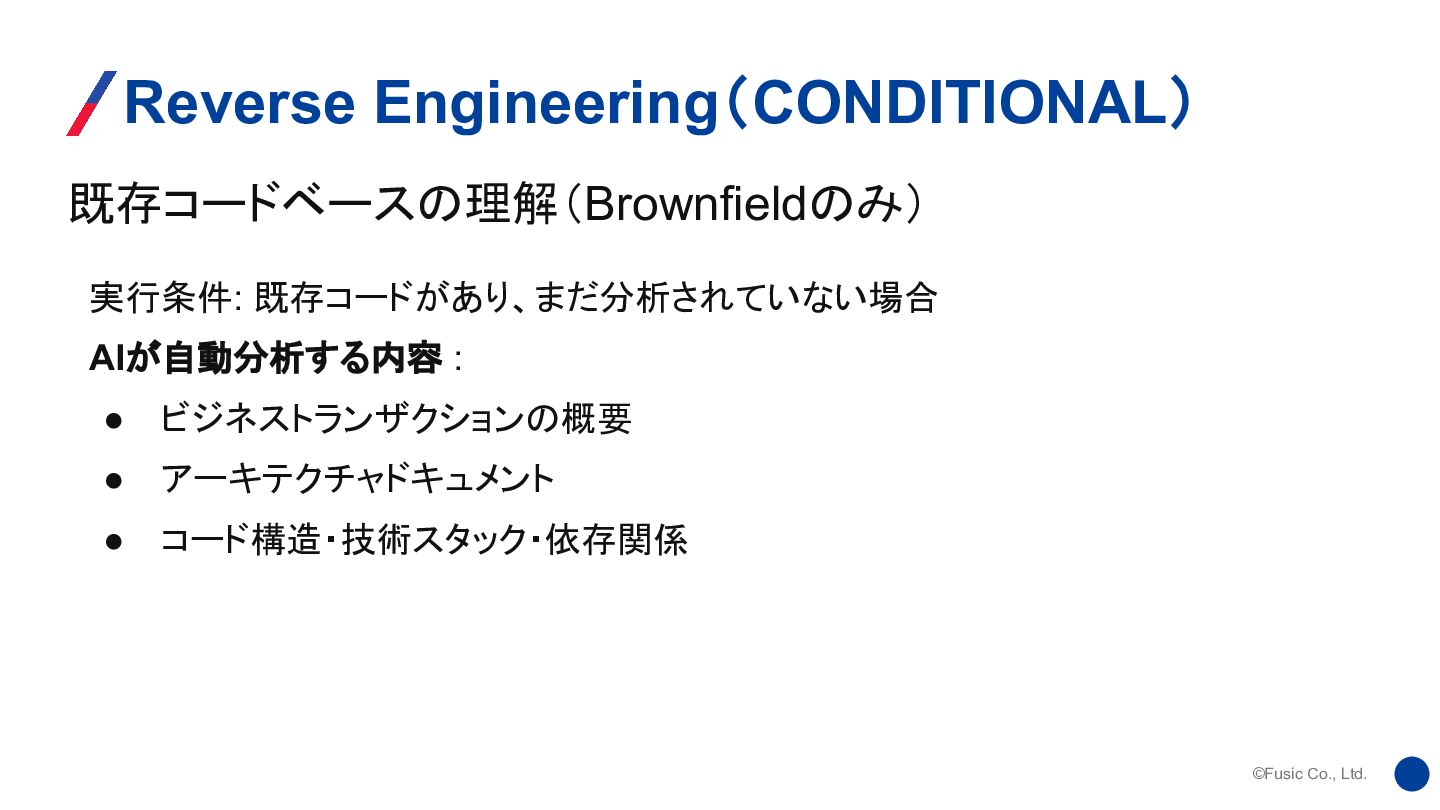©Fusic Co., Ltd. 既存コードベースの理解(Brownfieldのみ) Reverse Engineering(CONDITIONAL) 実行条件: 既存コードがあり、まだ分析されていない場合 AIが自動分析する内容 :