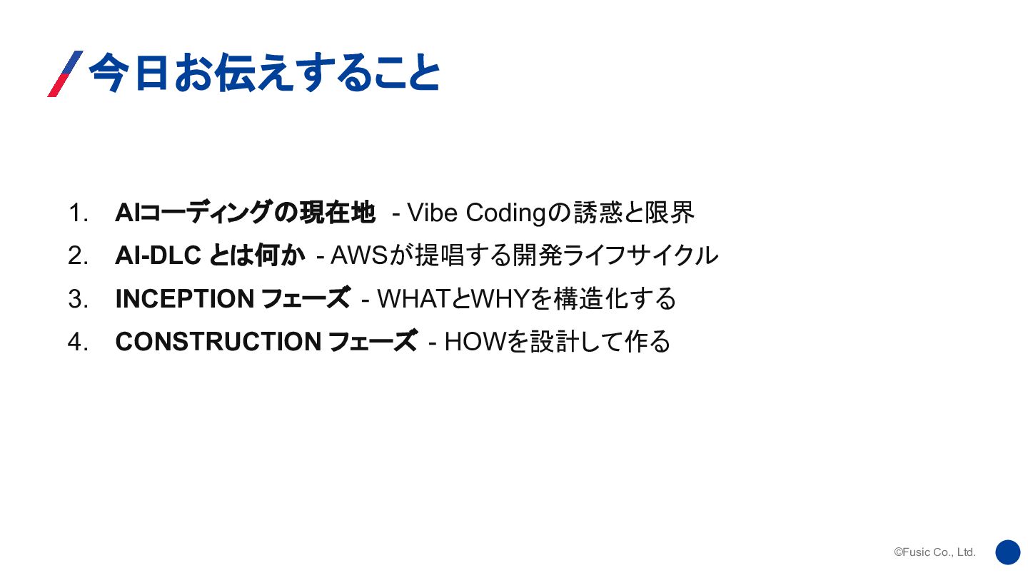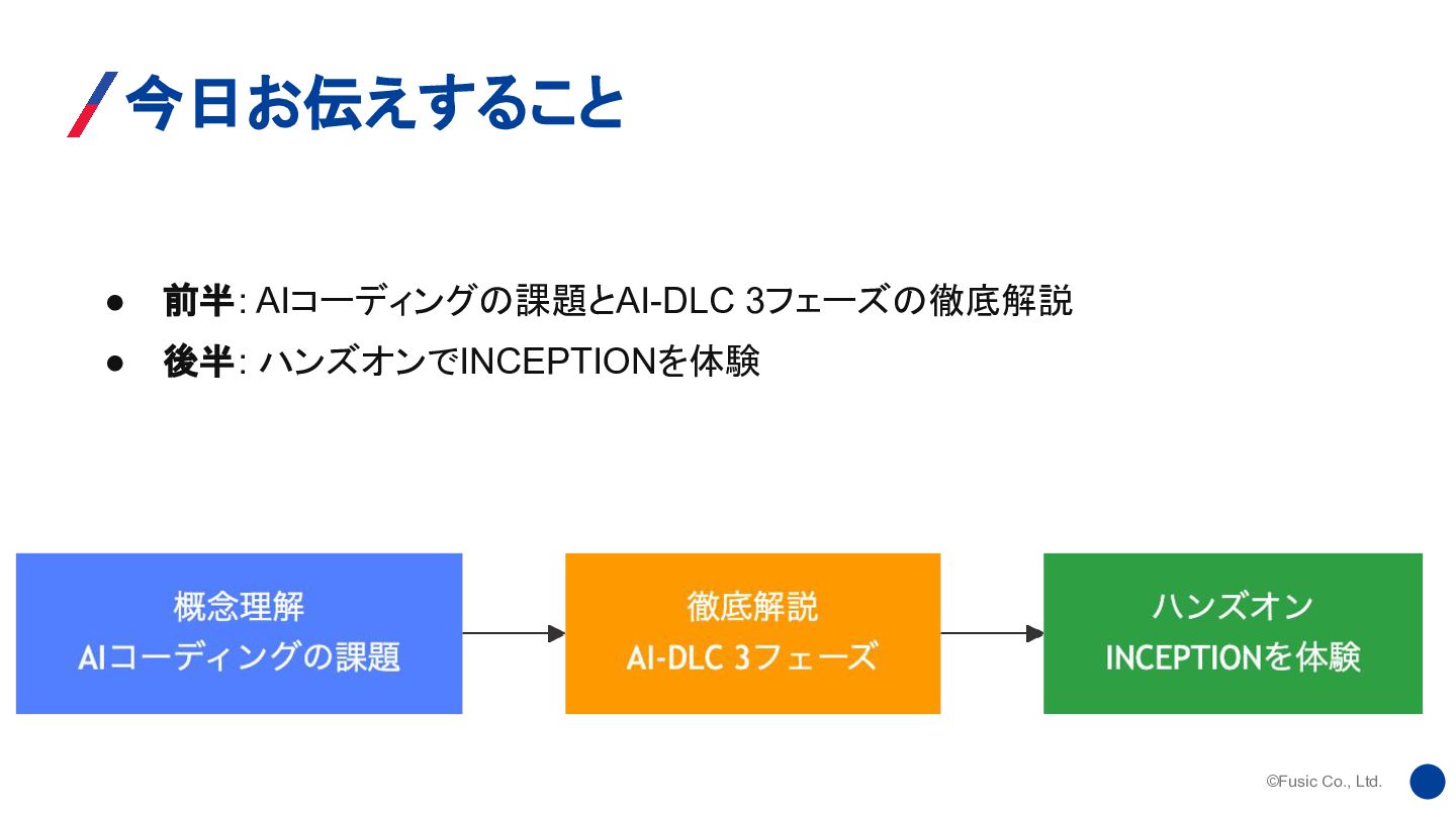 ©Fusic Co., Ltd. 今日お伝えすること • 前半: AIコーディングの課題とAI-DLC 3フェーズの徹底解説 • 後半: