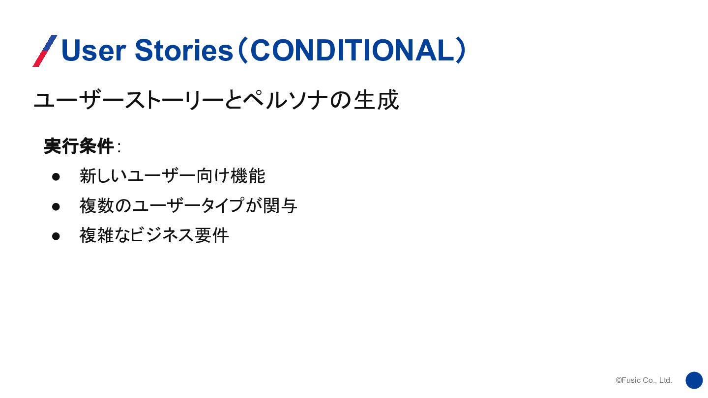 ©Fusic Co., Ltd. ユーザーストーリーとペルソナの生成 User Stories(CONDITIONAL) 実行条件: • 新しいユーザー向け機能 •