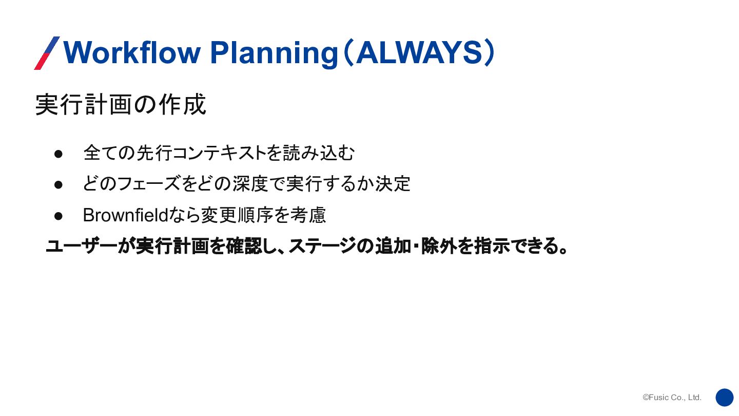 ©Fusic Co., Ltd. 実行計画の作成 Workflow Planning(ALWAYS) • 全ての先行コンテキストを読み込む • どのフェーズをどの深度で実行するか決定