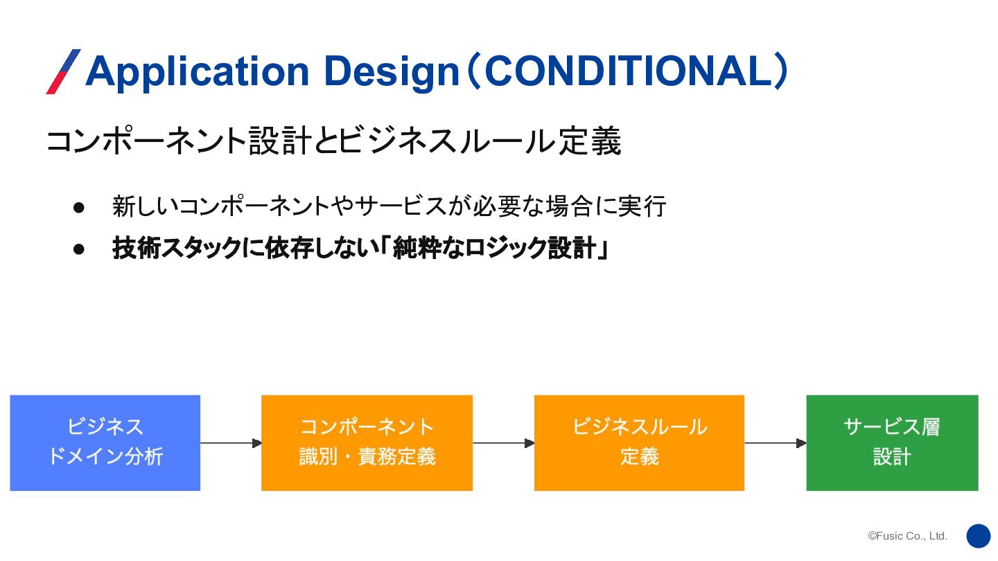 ©Fusic Co., Ltd. コンポーネント設計とビジネスルール定義 Application Design(CONDITIONAL) • 新しいコンポーネントやサービスが必要な場合に実行 • 技術スタックに依存しない「純粋なロジック設計」