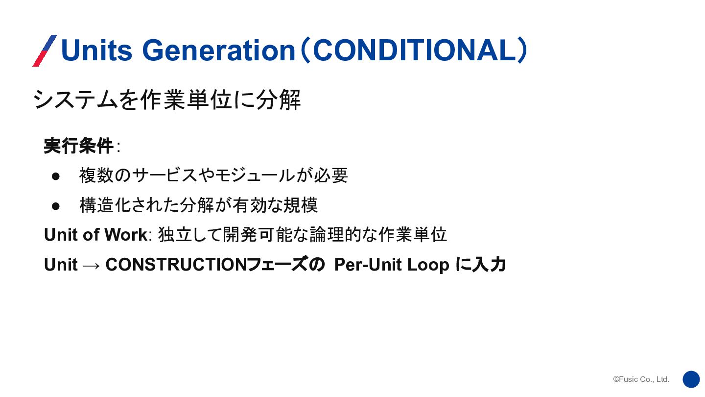 構造化された分解が有効な規模 Unit of Work: 独立して開発可能な論理的な作業単位 Unit → CONSTRUCTIONフェーズの Per-Unit Loop に入力