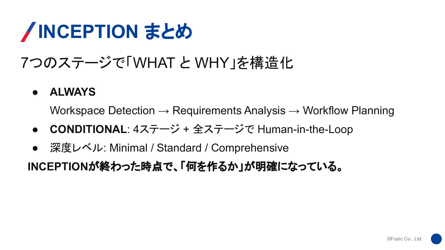 Workspace Detection → Requirements Analysis → Workflow Planning • CONDITIONAL: 4ステージ + 全ステージで Human-in-the-Loop • 深度レベル: Minimal / Standard / Comprehensive INCEPTIONが終わった時点で、「何を作るか」が明確になっている。