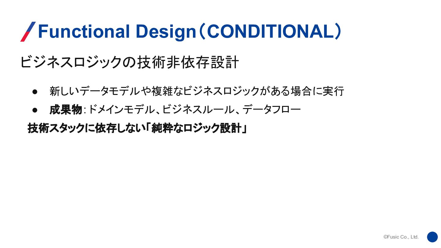©Fusic Co., Ltd. ビジネスロジックの技術非依存設計 Functional Design(CONDITIONAL) • 新しいデータモデルや複雑なビジネスロジックがある場合に実行 • 成果物: