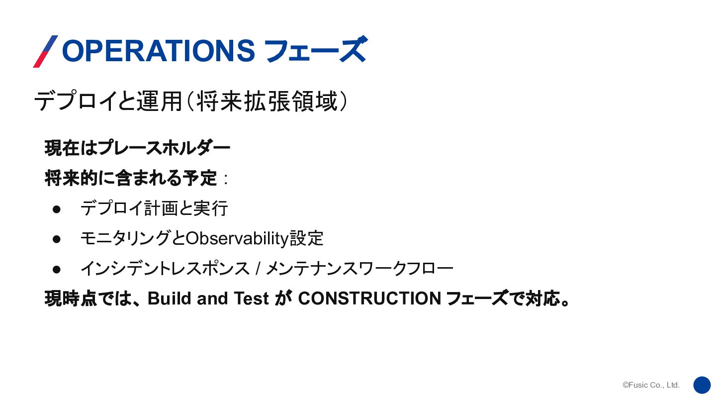 デプロイ計画と実行 • モニタリングとObservability設定 • インシデントレスポンス / メンテナンスワークフロー 現時点では、 Build and Test が CONSTRUCTION フェーズで対応。