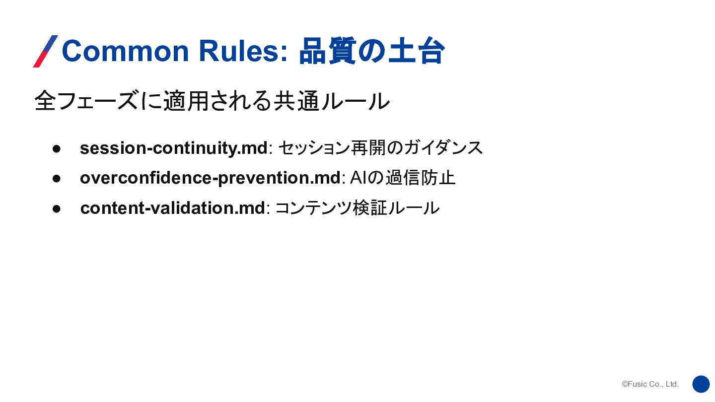 ©Fusic Co., Ltd. 全フェーズに適用される共通ルール Common Rules: 品質の土台 • session-continuity.md: セッション再開のガイダンス