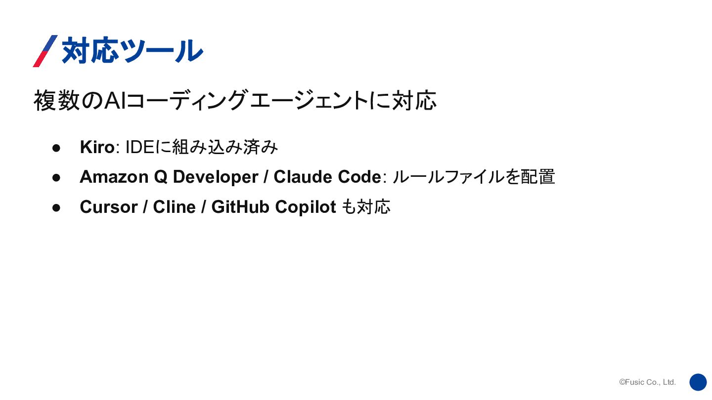 ©Fusic Co., Ltd. 複数のAIコーディングエージェントに対応 対応ツール • Kiro: IDEに組み込み済み • Amazon