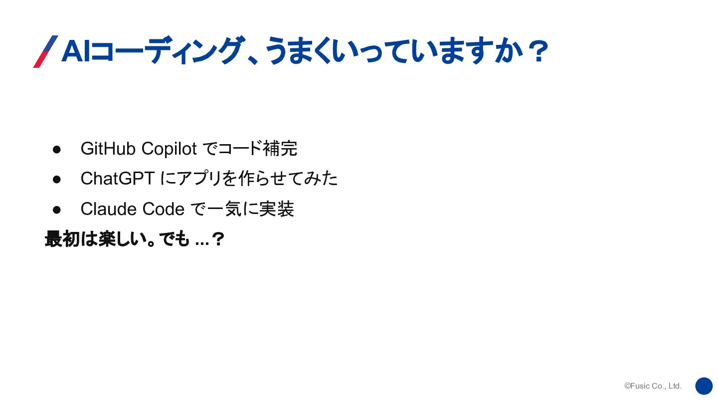 ©Fusic Co., Ltd. 今日お伝えすること 1. AIコーディングの現在地 - Vibe Codingの誘惑と限界 2.