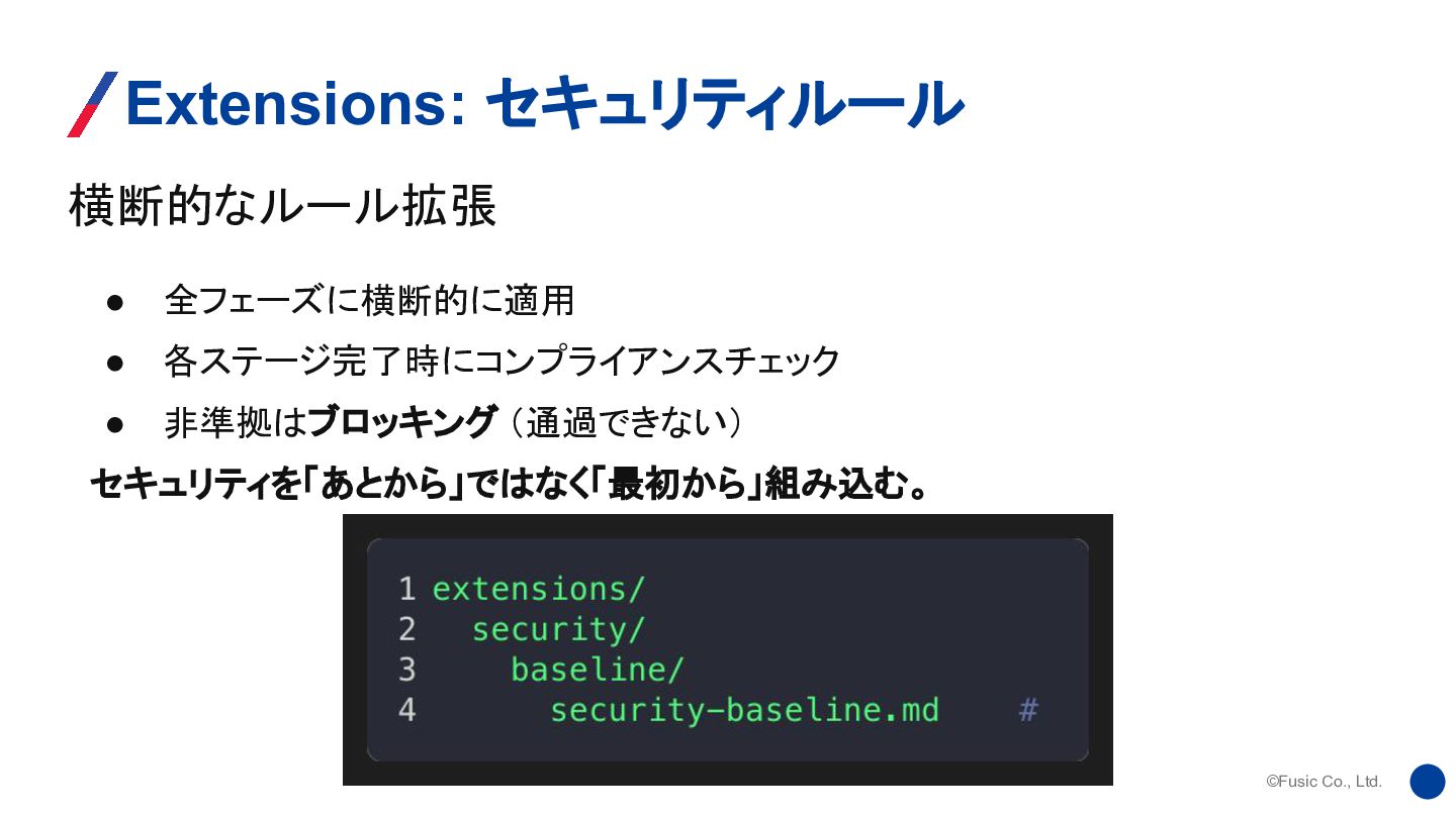 ©Fusic Co., Ltd. 横断的なルール拡張 Extensions: セキュリティルール • 全フェーズに横断的に適用 • 各ステージ完了時にコンプライアンスチェック