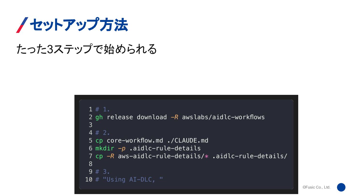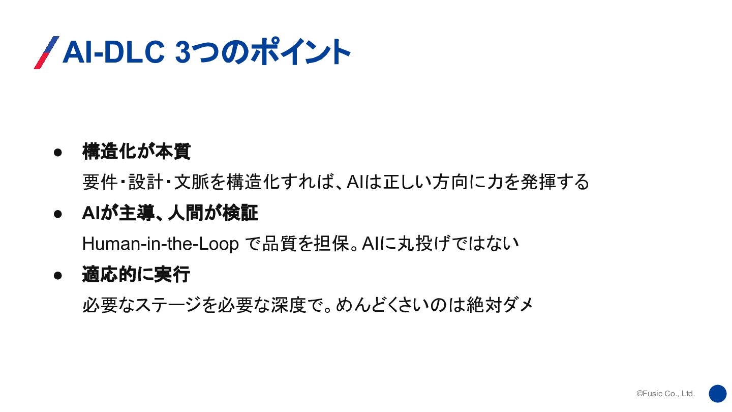 ©Fusic Co., Ltd. AI-DLC 3つのポイント • 構造化が本質 要件・設計・文脈を構造化すれば、AIは正しい方向に力を発揮する • AIが主導、人間が検証